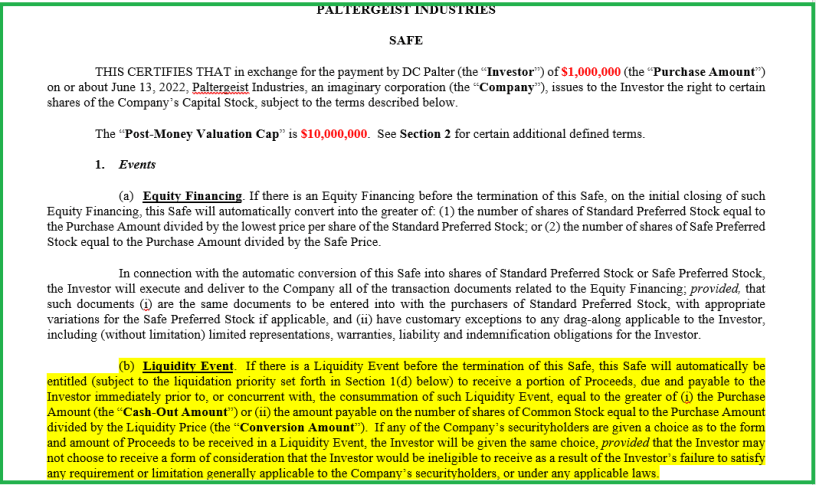 In most cases, the liquidation preference is “1x”, meaning the investor is guaranteed at least her money back. The standard SAFE note includes a 1x liquidation preference. However, 1.5x and 2x liquidation preferences aren’t uncommon, and I’ve even been in a deal with a 4x liquidation preference.