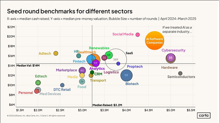 In their report State of the Pre-Seed 2025, Carta shows a median valuation of $15M for a pre-seed raise and $30M for a larger seed raise.